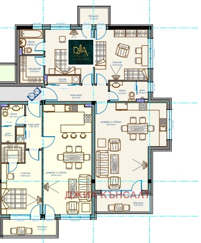 Разпределението на апартамента е следното: коридор, дневна с кухненски бокс, две спални, гардеробна, две бани с тоалетни, склад и два балкона. Чистата жилищна площ на апартамента е 113,65 кв.м. Двете спални с балкон гледат на С/И, а трапезарията с кухненският бокс отново с балкон на Изток и Юг.
