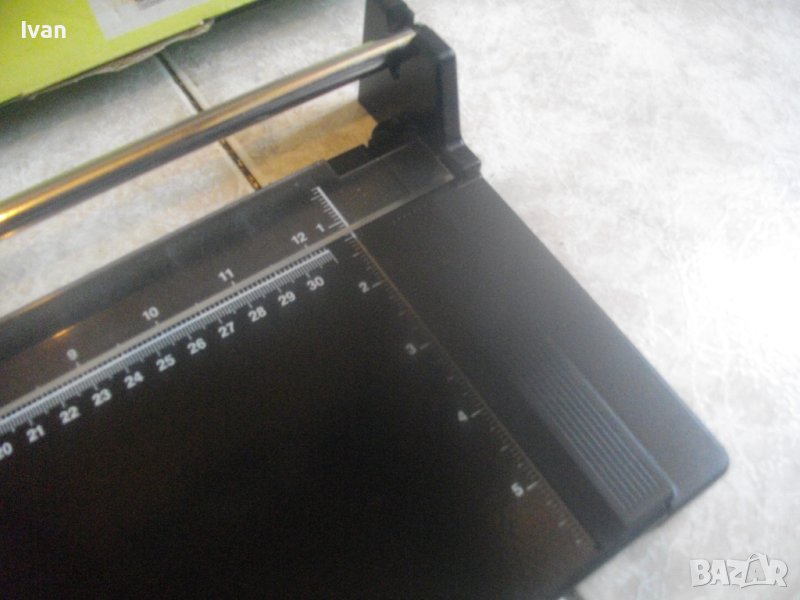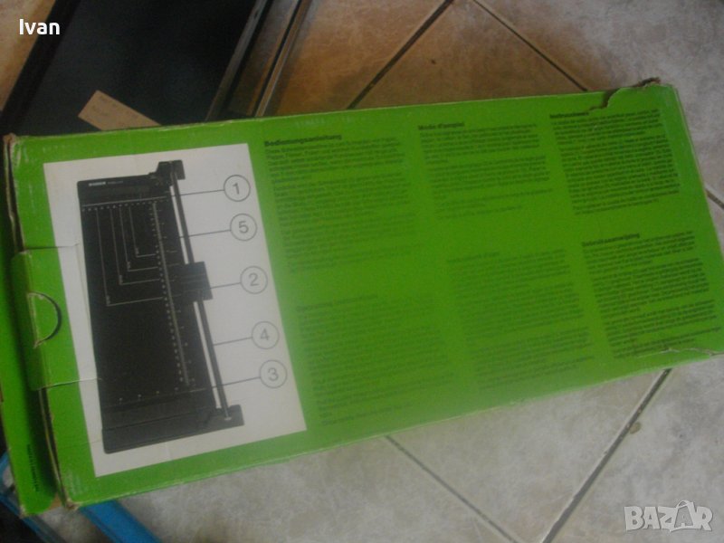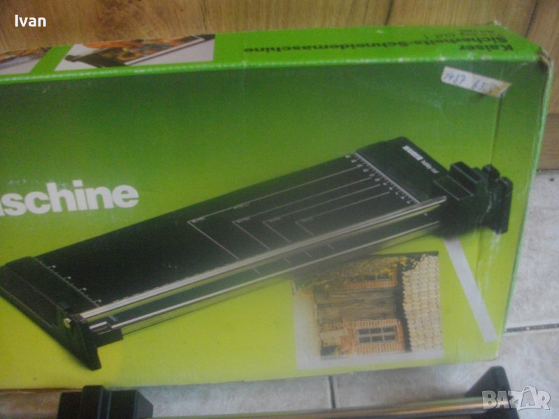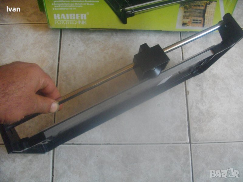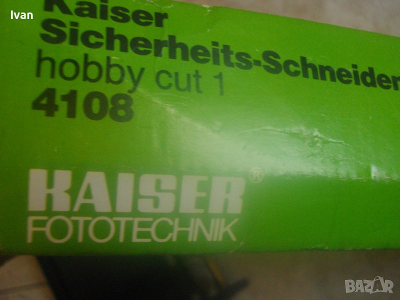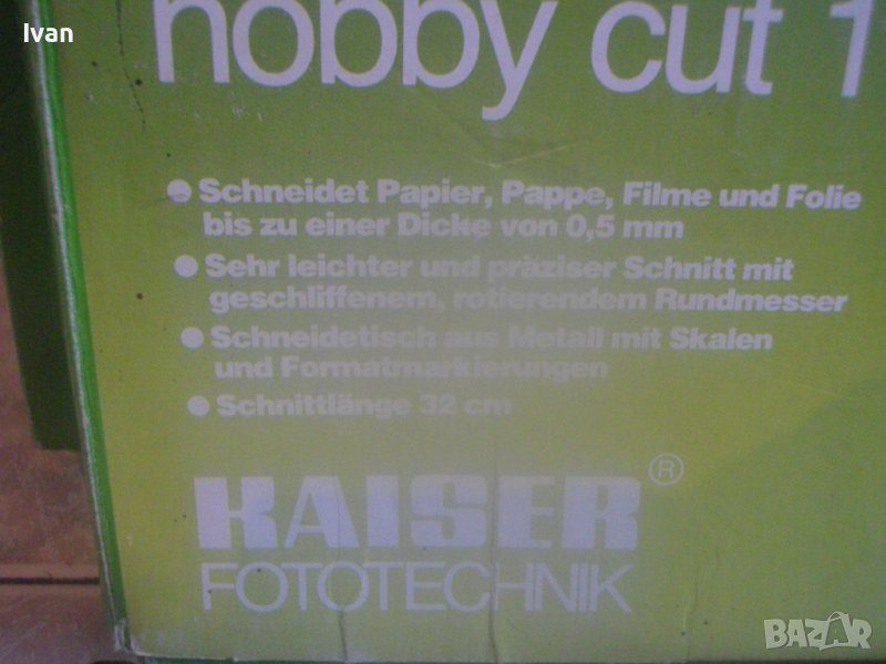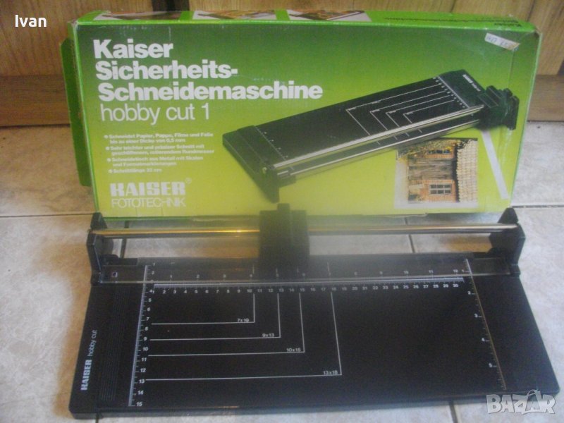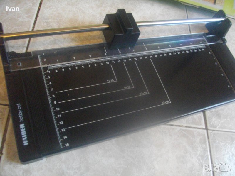 ОПИСАНИЕ на гилотина / резачка / ролков нож за рязане на хартия. Съвсем нова, неизползвана и неупотребявана. Във фабричната си картонена опаковка. Старо качество немско оригинално произовдство Западна Германия. Марка и модел на инструмента - Kaiser Hoby Cut 1 - 4108. Производител -KAISER FOTOTECHNIC.За рязане на хартия, снимки чрез ролков нож диск с дебелина 0,5 мм и срез 0,5 мм. Рязане на хартия, табак, картон, снимки с дължина до 32 см. Ширина рязане до 15 см. Оразмерена основа плот на дължина до 32 см и на ширина до 15 см. основата е масивна метална, с твърди пластмасови държки от двете страни. Ролковият нож за рязане е сменяем, размер кръгъл ф 40 мм. приидвижващ се на метално инокс неръждавейка рамо по цялата дължина на рязането 32 см. На долната основа отдолу ее наличен оригиналния стикер за производство - W. Germany - fabrigue en R.F.A. Тегло на гилотината/резачка/ролков нож - 2,0 кг.