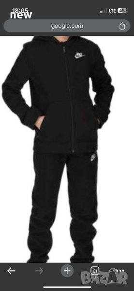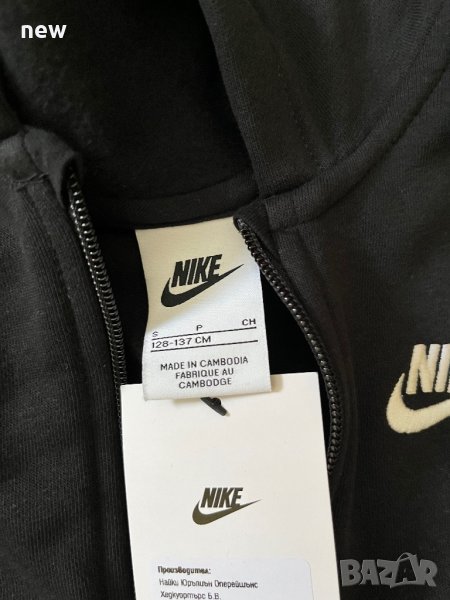Детски анцуг Nike с класическа кройка. Ежедневна комбинация, състояща се от горнище с цип и долна част, изработен от мек памук, топъл и удобен. Размер S в черен цвят. Размера е за 8-10 години. Височина 128-134 см. Емблемата е шита Подарък ни е, но за съжаление ни е малък.