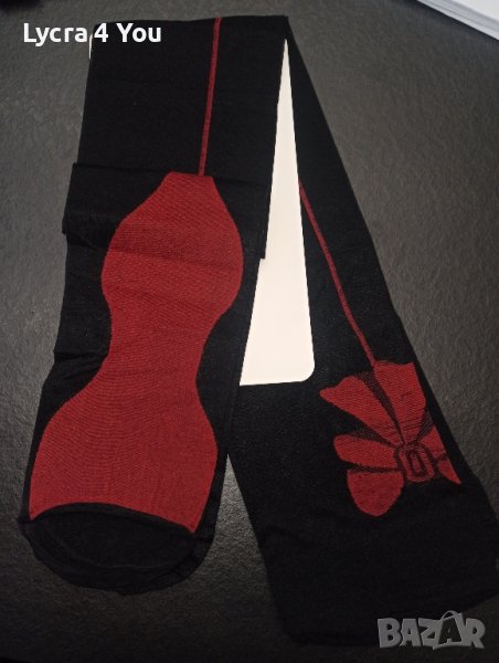 Нови в опаковка, дамски черни чорапи за жартиери. С ластична лента в горната си част за носене и без жартиери. С червена панделка отзад на чорапа, червен ръб и пета.