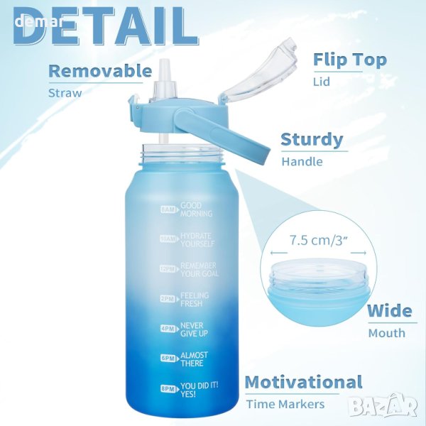DEARRAY 2 литрова тританова спортна бутилка за вода със сламка