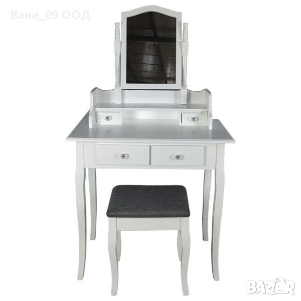 тоалетка с огледало в античен стил в комплект с табуретка с размери на продукта Ш:80/Д:40/В:142 см. Красив и елегантен избор за обзавеждане на спалнята. Тоалетката има всичко необходимо за провеждането на безупречни разкрасителни процедури. Практично моделирана предоставя удобно място за съхранение на тоалетните принадлежности, както и на други малки предмети от ежедневието. Състои се от плот в сив цвят с надсторйка с 2 чекмеджета, както и регулируемо огледало, поставен на елегантна конструкция е 2 чекмеджета и 4 дизайнерски крака. Декорирана в бял цвят създава усещане за чистота и свежест. Чекмеджетата към тоалетката са отваряеми посредством елегантни прозрачни дръжки. Със своя красив дизайн, тоалетната масичка ще добави с лекота чар към помещението.