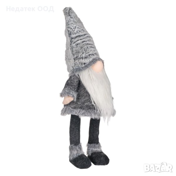 Коледна декоративна фигура на гном на Дядо Коледа в сив костюм, плюшена шапка и дълга брада.Той стои прав и тялото му с желязната пружина вътре което позволява движение.