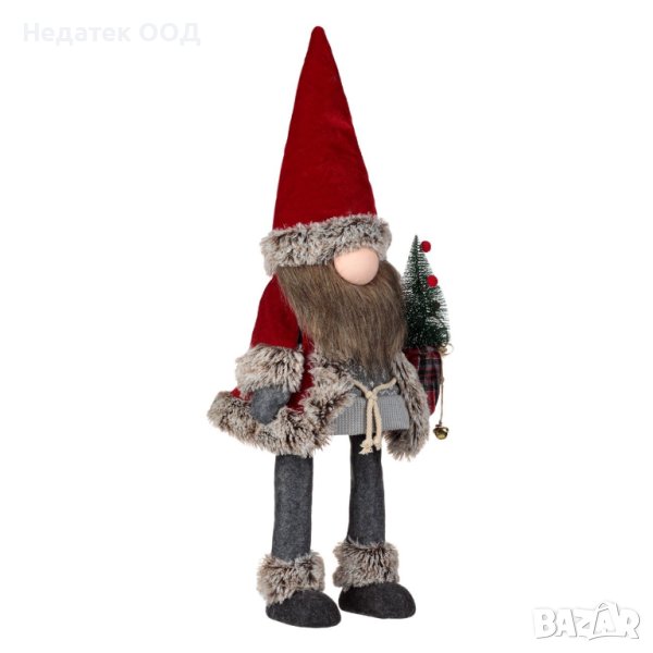 Коледна декоративна фигура на гном на Дядо Коледа в сив жакардов костюм, космата червена шапка и пелерина и дълга брада. Той държи чувал с ела и златни камбанки. Той стои прав и тялото му с желязната пружина вътре е в движение.