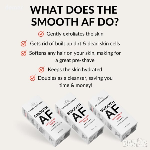 Комплект за почистване, ексфолиране, хидратиране и овлажняване. Изпитайте магията на ексфолиращия скраб Smooth AF - той ефективно премахва мъртвата кожа и мръсотия от лицето и скалпа ви, но е достатъчно нежен за чувствителната кожа. Освен това омекотява космите, което го прави идеалното решение преди бръснене. И познай какво? Освен това е и почистващо средство, което ви спестява време и пари!