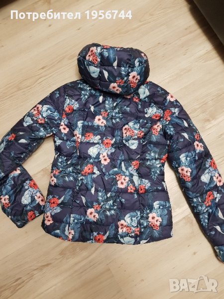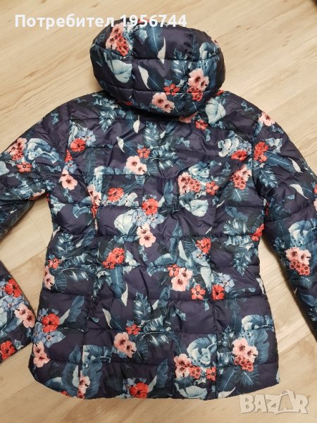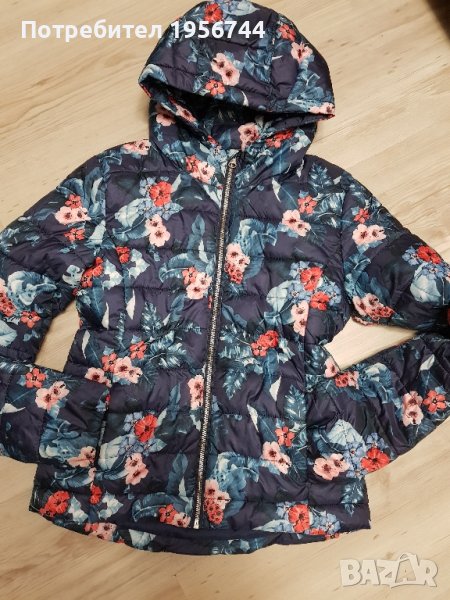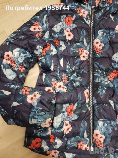 Детско якенце, много красиво, топло и стилно с красиви флорални мотиви, много актуално, размер 140см/става за госпожица на 9-10г/. С два джоба за ръце отстрани, с качулка за защита срещу лошо време. Закопчаване с цип и висока яка с предпазител за брадичката. - Ръкавите са завършени с еластични кантове. Обличано броени пъти!