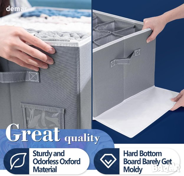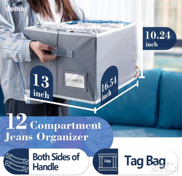 Представяме ви голямата версия на органайзера за дънки, сега надграден до просторен размер 35 x 28 x 20 см, като всяко отделение е с размери 25 x 20 x 6 см. Тези по-широки и по-големи отделения са проектирани да побират дънки за възрастни, палта, панталони, ризи, пуловери и др. Благодарение на пластмасови дъски, поставени отстрани, този органайзер за дрехи поддържа формата си и остава изправен, без да се сгъва. Освен това лесно се сгъва и спестява място, когато не се използва, благодарение на подвижната долна дъска. Изработен от качествена оксфордска тъкан, той е едновременно здрав и без мирис, с мрежест дизайн, който насърчава вентилацията, поддържайки дрехите ви свежи и чисти. Сбогувайте се с бъркотията и кажете здравей на организирания килер и чекмедже. Този органайзер за дрехи в гардероба е идеален за подреждане на дрехи, включително тениски, панталони, бельо, сутиени, клинове, пуловери, шапки и различни размери дрехи, като ви помага да спестите място и да намерите това, от което се нуждаете с лекота.