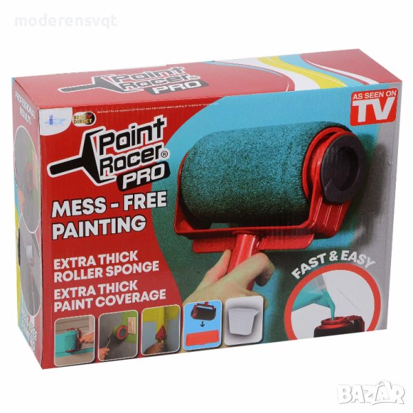 С лесния за пренасяне, ръчен Paint Racer боядисването е бързо, лесно и чисто. Тайната на Paint Racer Pro е вътрешният резервоар за боя, където тя се съхранява, докато ролерът я абсорбира и разпределя равномерно върху боядисваната повърхност. С aint Racer Pro спестяваш време, защото не се налага да пълниш отново ролера с боя. Все едно имаш пълна кутия с боя в ръцете си.