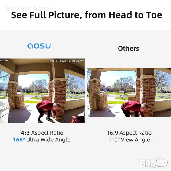 Вижте цялата картина в 2K резолюция: С 166° широк зрителен ъгъл, съотношение на страните 4:3 можете да видите човек от главата до петите или пакета на земята Вижте цялата картина в 2K резолюция.