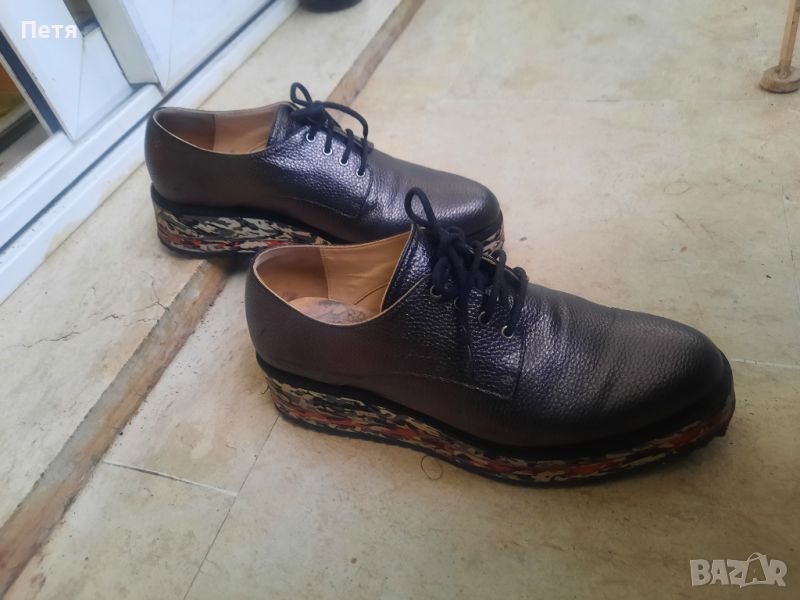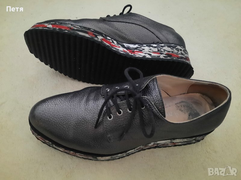 черни обувки 38 номер естествена кожа имат интересен отблясък ,а подметката е в бяло , червено и сиво равна и повдигната около 3 см Използвани са миналата година малко и са много запазени почти без следи от употреба външно . Изпращам с преглед и тест по Еконт .
