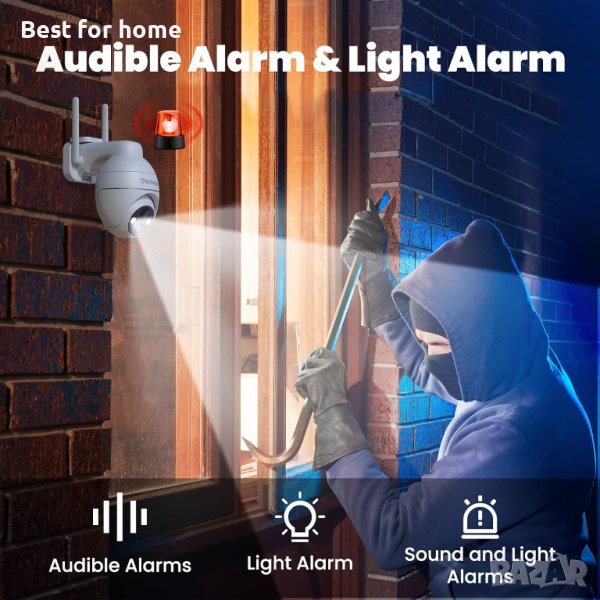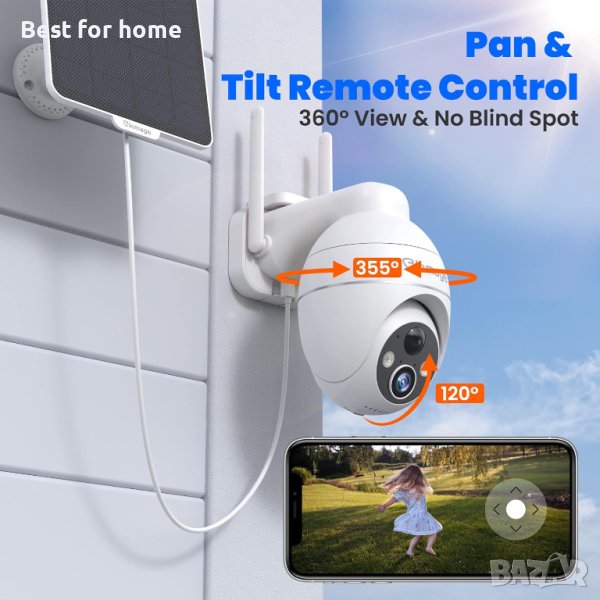 Безжични камери за сигурност elemage, 2K 3MP соларна външна камера с 360°PTZ изглед, 2,4 Ghz WiFi, цветно нощно виждане, откриване на движение, аларма със сирена, двупосочен разговор, IP65