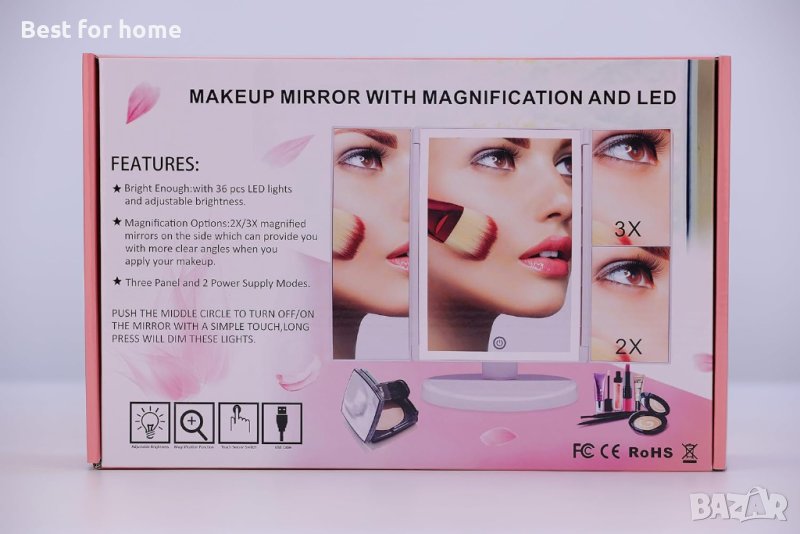 Огледало за маса: Това огледало за грим със светлини стои стабилно самостоятелно върху плота ви и може да бъде свободно регулирано и фиксирано на 180°, осигурявайки перфектен и удобен ъгъл на гледане. А основната вдлъбнатина може да побере бижута или козметика като часовник, обеци, гривни и др. Перфектен подарък за дами и момичета.
