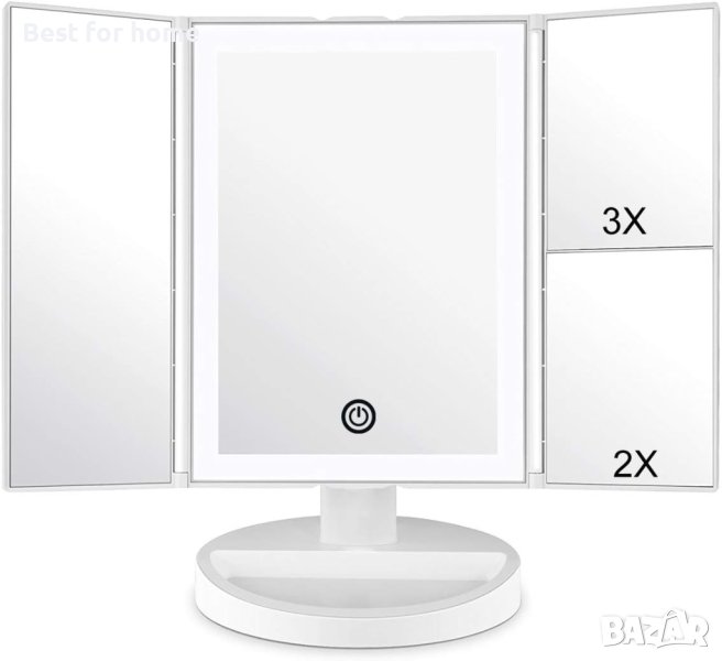 огледало за грим с LED осветление и сензорен екран, трикратно сгъване 1x 2x 3x увеличение, 180° регулируемо завъртане, захранване от батерия и USB, козметично огледало за плот (бяло)