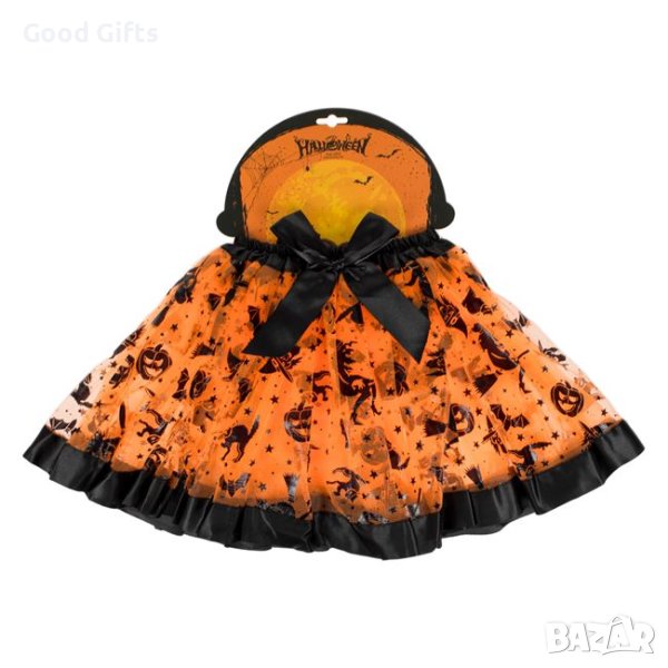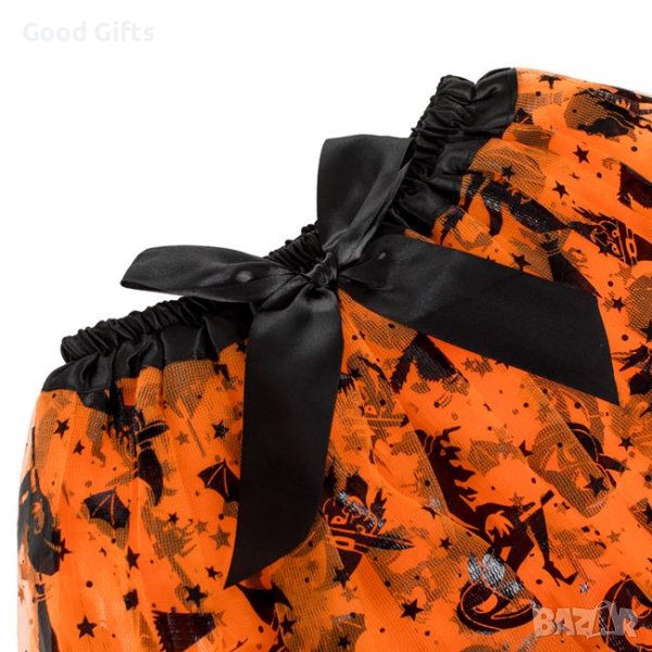 Детска оранжева маскираща пола с черна панделка и дизайни на тикви, вещици, прилепи и др. Има ластик в талията и е с дължина 31см. Идеална е за вашите маскировки за Хелоуин!