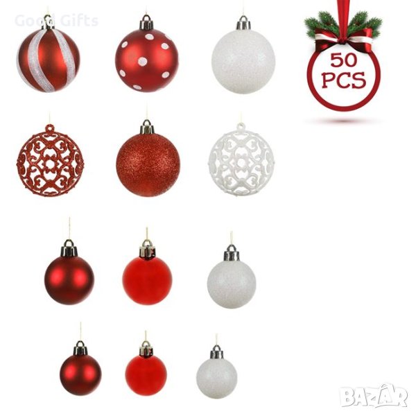 50 броя Комплект Бели и червени коледни топки в 3 размера: 3-4-6cm