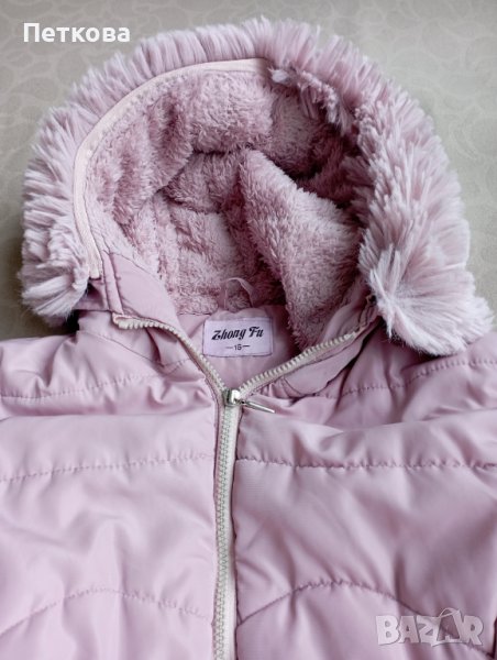 Страхотно зимно яке в цвят пепел от рози. Номер 16, с несваляща се качулка и топла подплата. Закопчава се с цип и има два джоба.
