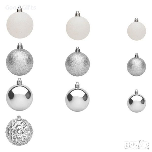 50 броя Комплект коледни топки, Сребристобели в 3 размера → Обява 42672528