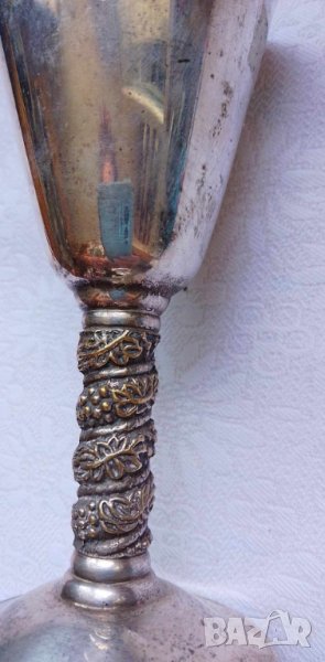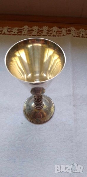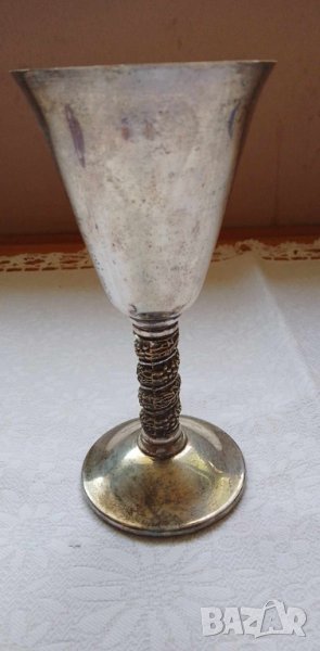 Чаша за вино със сребърно покритие и красива плетеница на столчето. Не е почиствана, няма наранявания, произведена в Испания. Вместимост 100 мл до ръба.