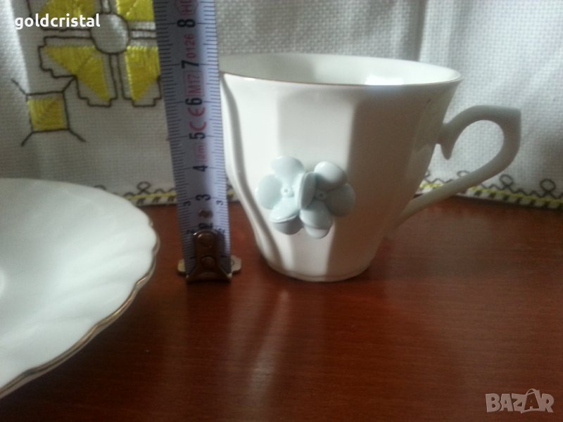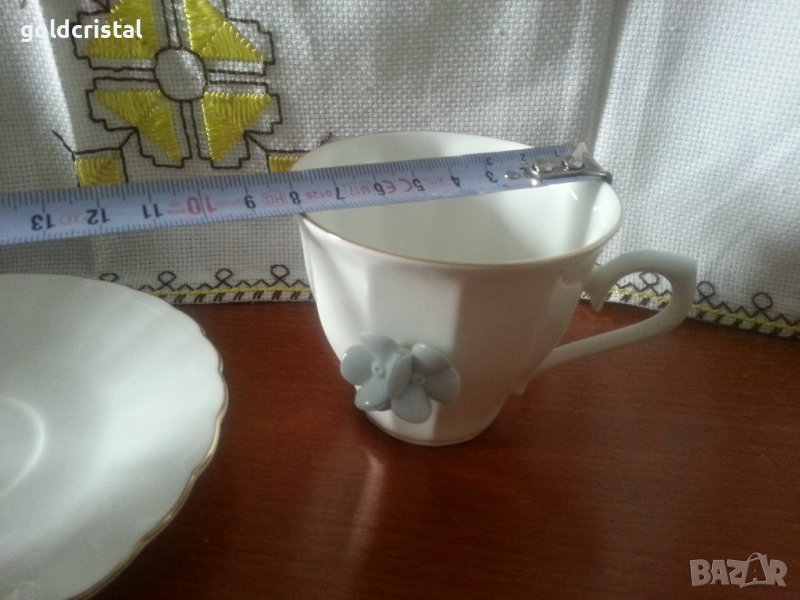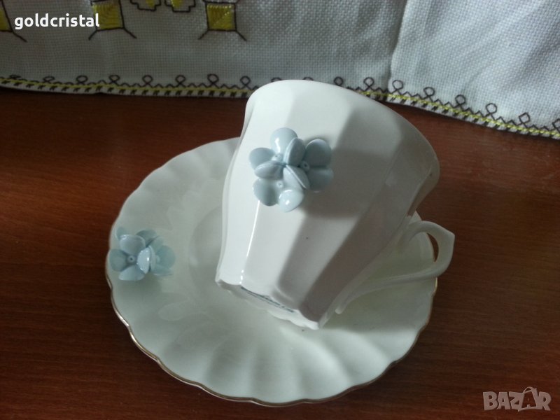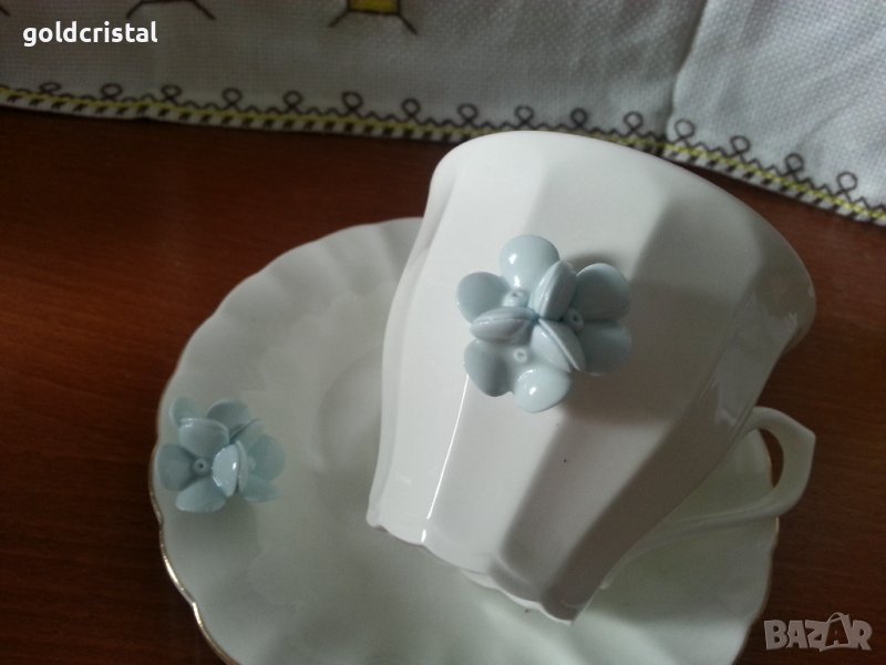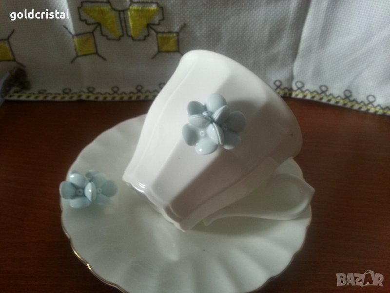 Стар български костен порцелан Бононя сет чаша за чай кафе 180мл с чиния с синьо цвете -49лв сет чай кафе 180мл с пластика порцелан ръчна изработка сервиз комплект сет лот ретро арт декор винтидж колекция стари антикварни предмети обзавеждане за дома и семейството подходящи за подарък за ценители и колекционери