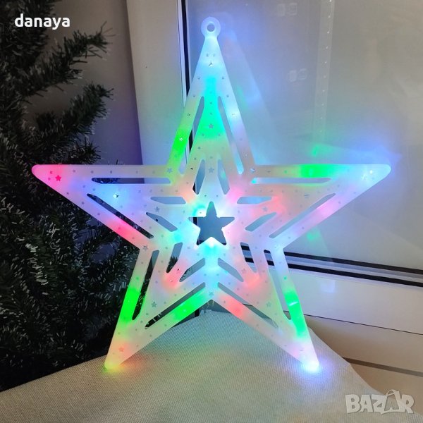 Голяма светеща коледна украса за стена или прозорец. Светеща звезда с 35 led лампички. Звездата с е предлага в два модела – с многоцветни преливащи светлини и светеща в бяла светлина. Работи на ток.