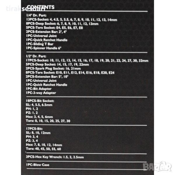 - 17х Накрайници (30L): SL8, 10, 12, T40, 45, 50, 55, 60, PH3, 4, PZ3, 4 HEX, 7, 8, 10, 12, 14 мм