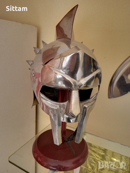 шлема е метален,гладиаторски,може да се носи на главата,реален размер,уникат