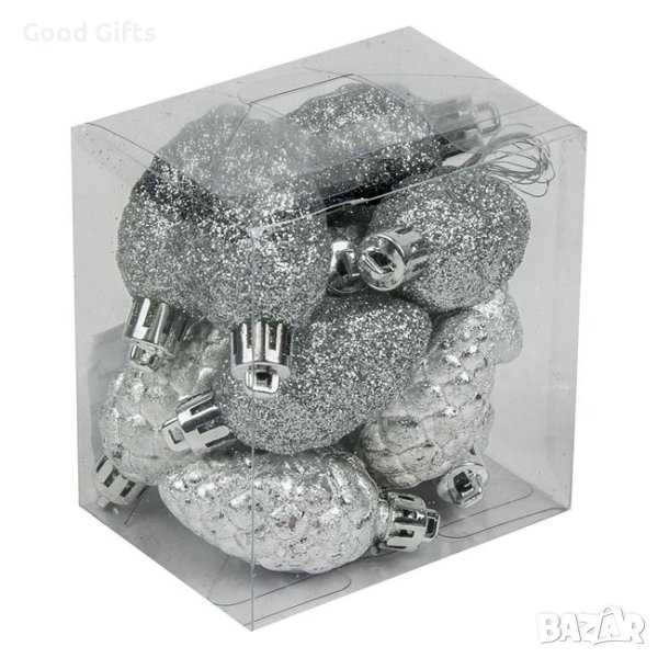 12 броя Комплект Сребристи коледни шишарки, Висулки за елха, 5см → Обява 42686063