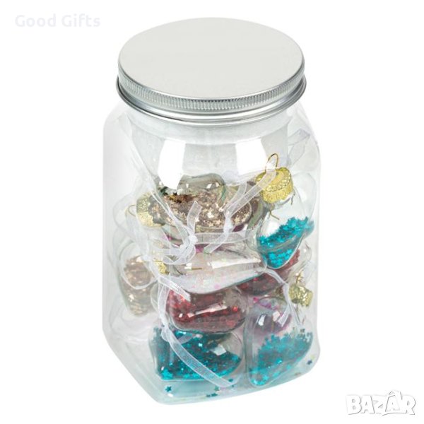 Коледни украшения за елха, стъклени прозрачни звезди и сърца в пластмасов буркан.