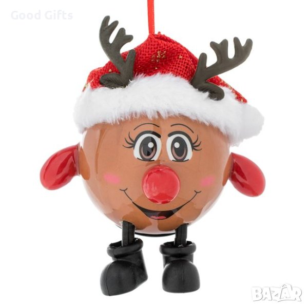 Топка за коледно дърво, Коледен елен с червена шапка и нос с мигащ светодиод. Има бутон за включване/изключване. Работи с 3 батерии LR44 (включени).
