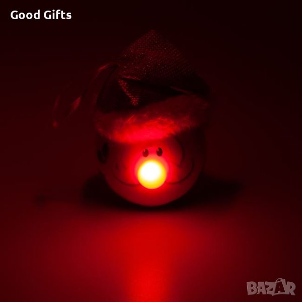 Топка за коледно дърво, Дядо Коледа с червена шапка и нос с мигащ светодиод. Има бутон за включване/изключване. Работи с 3 батерии LR44 (включени).