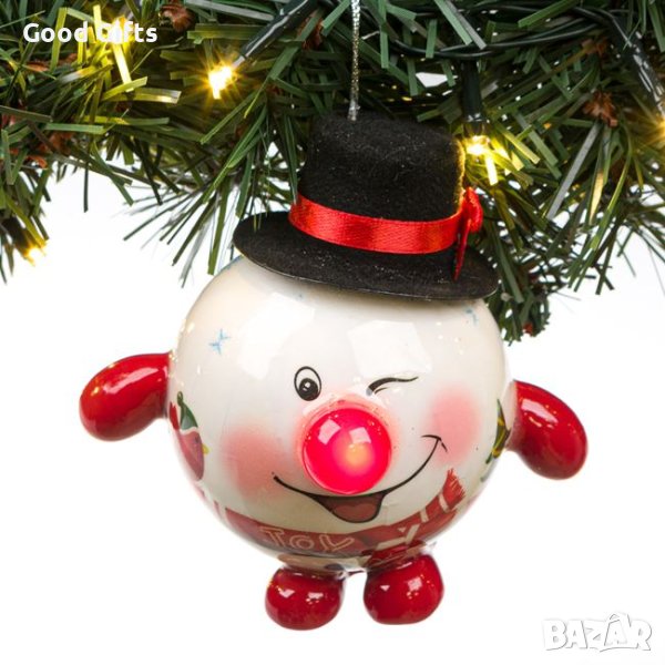 Топка за коледно дърво, Снежен човек с черна шапка и нос с мигащ светодиод. Има бутон за включване/изключване. Работи с 3 батерии LR44 (включени).