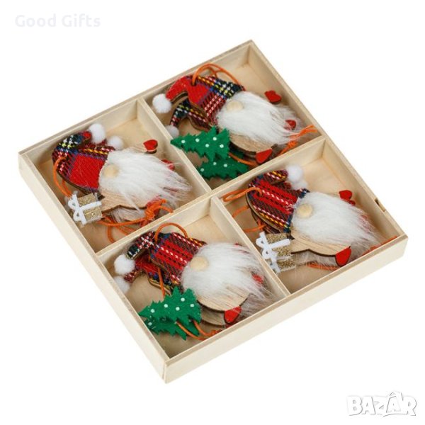 8 броя Дървени Висулки за елха, Гномчета с карирани шапки, 6см
