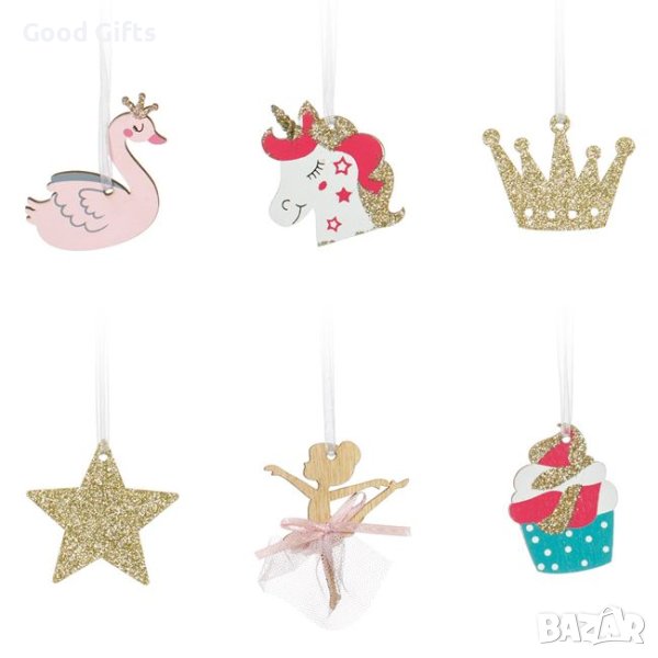 Орнаменти за коледна елха (5-6 см), дървени, розов лебед, еднорог бял/розов, балерина от розов тюл, сладолед на точки, блестяща корона и звезда в цвят шампанско, в кутия.