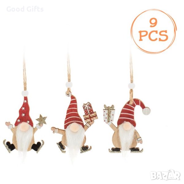 9 броя Дървени коледни висулки за елха, Гномче в 3 дизайна, 7см
