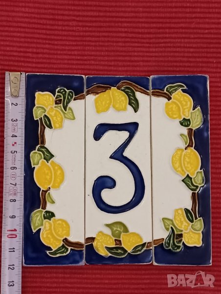 Номер на къща, керамичен ръчна изработка, Италия. Мотив лимони от три части, размер на плочка 10/3.5 см, общо 10/10.5 см.