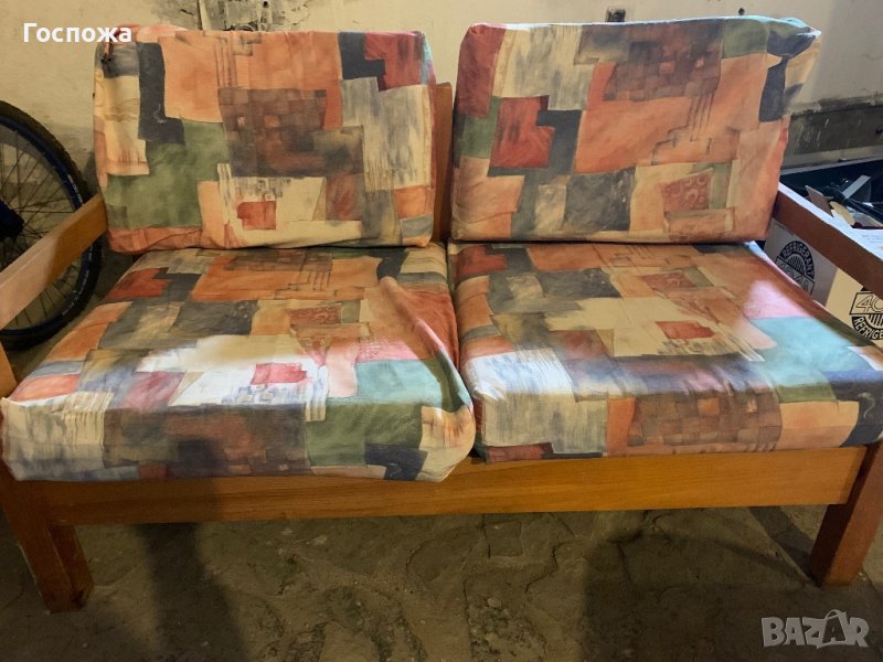Дървен диван двойка, който става и за градината или терасата. С меки възглавници за сядане и облягане. Те са от дунапрен, но оригиналната им дамаска е много скъсана. За това са сложени допълнителни калъфки на възглавниците, които са на снимките. Те са здрави и с цип и могат да се махат да се перат. Състоянието е съобразено с цената.