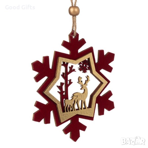 5 броя Дървени коледни висулки за елха, Снежинка с елен и сърна, 11см → Обява 42700190