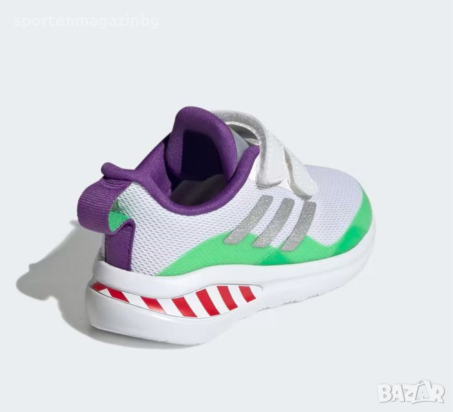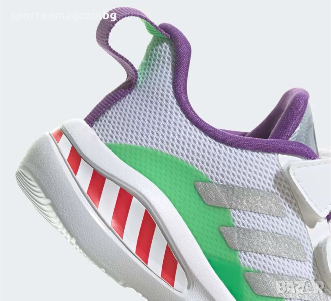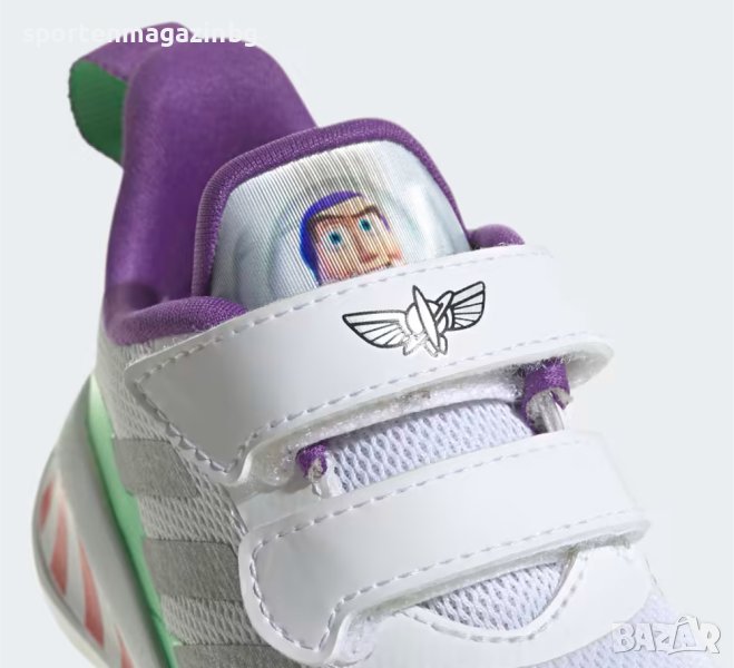 Външна част, изработена от висококачествени материали с текстил и синтетични елементи. Нисък профил за по-голяма свобода при движение. Две велкро ленти за лесно обуване и събуване. Текстилна кука в задната част за лесно обуване. Допълнително подсилени в областта на петата и пръстите. Три ленти от двете страни символизиращи марката. Графиката на Disney Pixar Buzz Lightyear, ©Disney, както и свежа цветова комбинация придават на маратонките поразителен външен вид. Подвижна, цветна, силно омекотена стелка и език. adiFIT - за определяне на точния размер. Междинната подметка е с Cloudfoam пяна, мекотата, гъвкавоста и амортизацията, с която разполага, осигурява отлично омекотяване и комфорт по време на движение. Външната подметка е набраздена с добро сцепление и силно устойчива на износване.