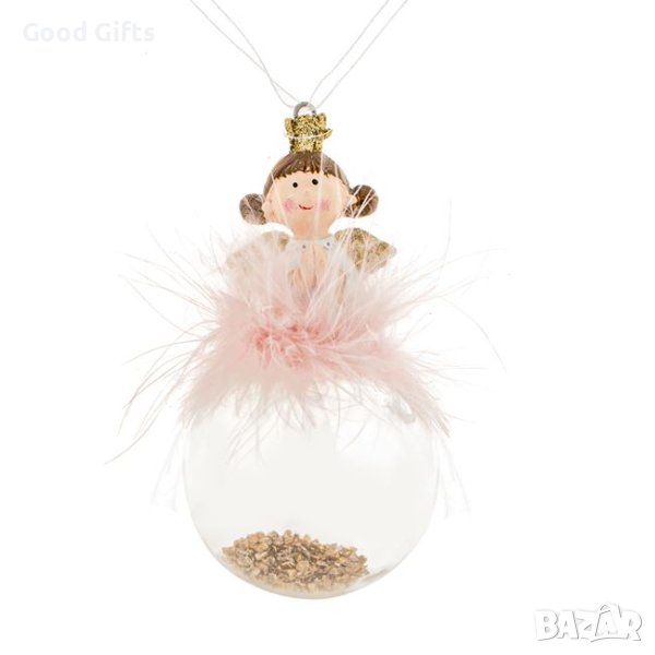 Керамично ангелче с розови пера, златни крила и корона, молещо се върху прозрачна топка със златен блясък вътре.
