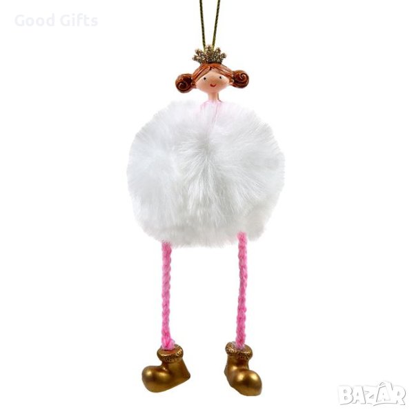 Украса за коледно дърво: Момиче, Керамика, с бяла пухкава рокля, корона и висящи розови крачета