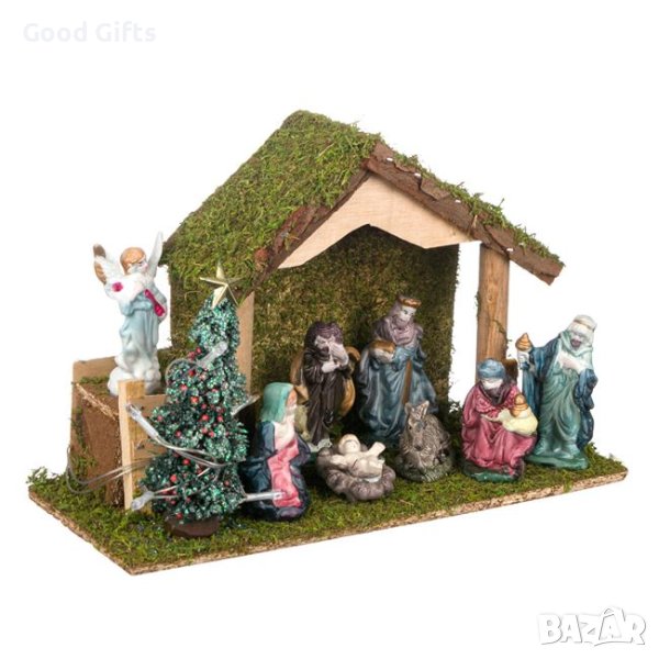 Коледна ясла със 9 фигури, които допълват образа и осветление с 5 диода. Работи с 2 батерии АА (не са включени).