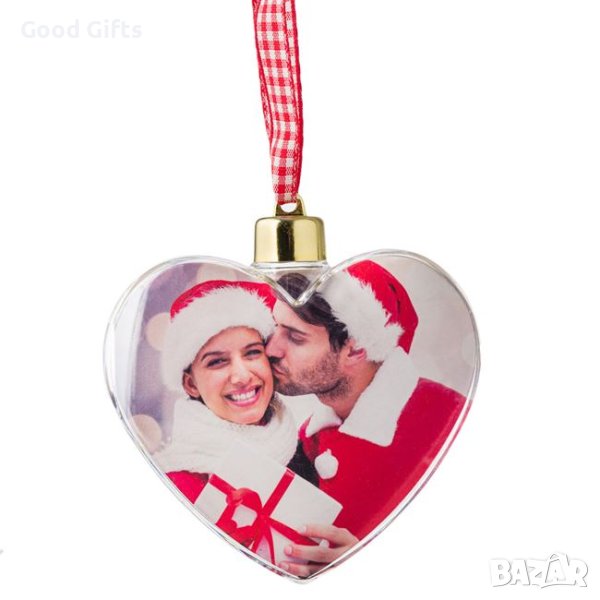 Прозрачна топка сърце за елха, в която можете да поставите своя снимка и да я направите уникална.