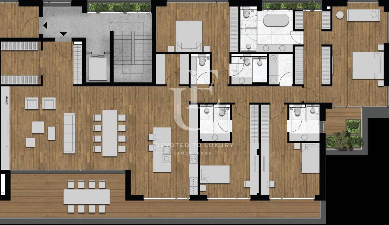 антре, дрешник, дневна с кухня и трапезария, килер, коридор, който води към спалните, спалня с дрешник и баня с тоалетна, две спални с баня с тоалетна, четвърта спалня, тоалетна, баня с тоалетна, мокро помещение, две панорамни тераси. Цената е без включен ДДС. Ref. ID:17924