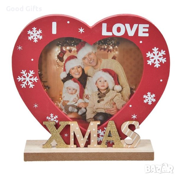 Коледна декоративна рамка сърце, дървена, в червен цвят със златни блестящи детайли, с послание "I love Christmas" и люспи.