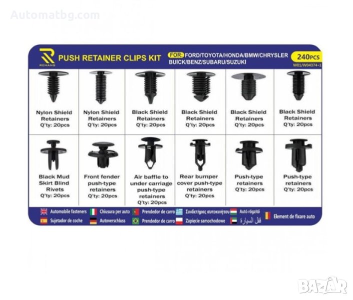 Универсални щипки Automat, 240бр, За Benz, Bmw, Honda, Toyota, Subaru, Ford, Suzuki, Chrysler, снимка 1 - Аксесоари и консумативи - 42703386 Универсални щипки Automat, 240бр, За Benz, Bmw, Honda, Toyota, Subaru, Ford, Suzuki, Chrysler, снимка 2 - Аксесоари и консумативи - 42703386 Универсални щипки Automat, 240бр, За Benz, Bmw, Honda, Toyota, Subaru, Ford, Suzuki, Chrysler, снимка 3 - Аксесоари и консумативи - 42703386 1/3