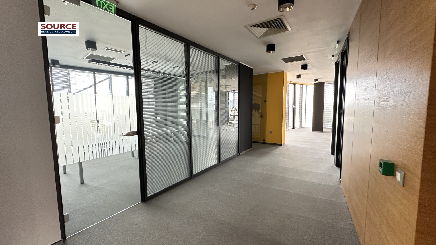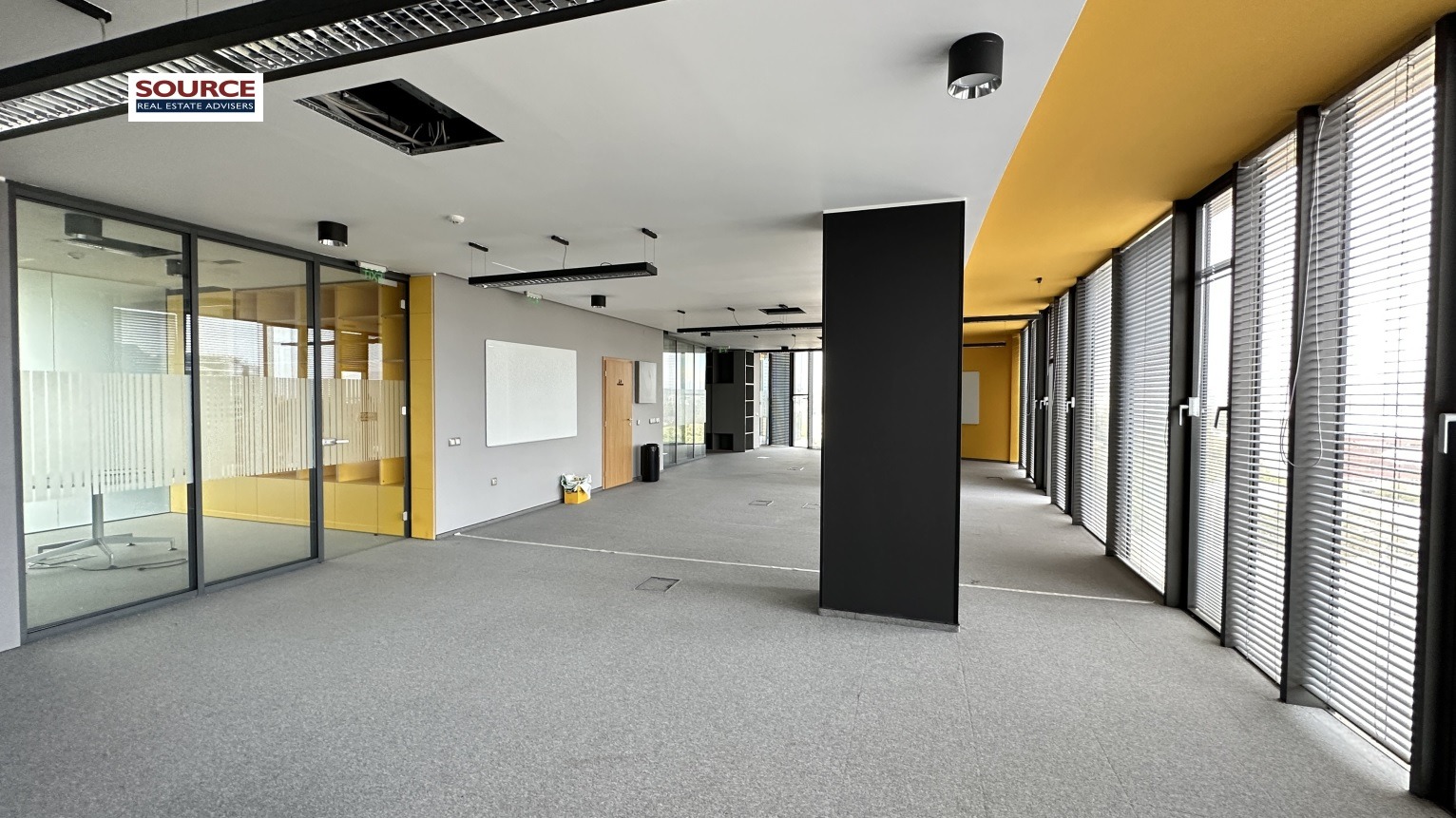 2. Разпределение: 2 големи Open space помещения, 5 отделни работни помещения преградени със стъклени и гипсокартонени преградни стени, оборудвана кухня, рецепция, 4 wc, тераса. Офисът може да бъде изцяло с Open space разпределение или допълнително преграден според изискванията на Наемателя.