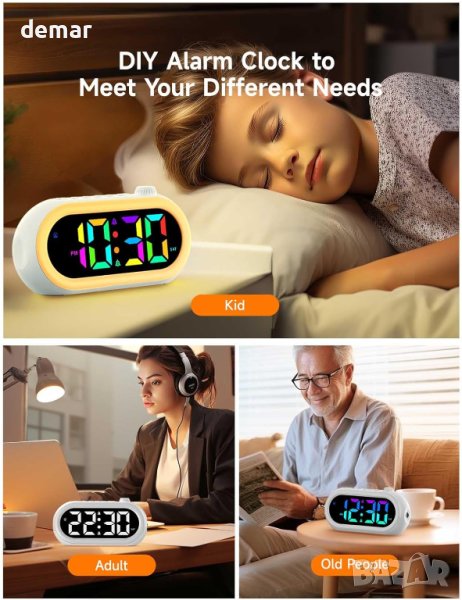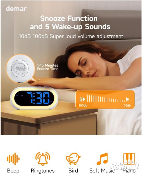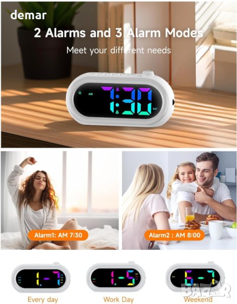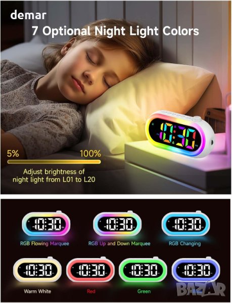 Събудете се естествено с нашия алармен часовник със симулация на изгрев, който постепенно осветява стаята ви за персонализиран интервал от 1-120 минути, преди да прозвучи предпочитаната от вас аларма от 5 налични опции, включително естествени звуци и мелодии. Този многофункционален часовник може да се похвали и с жив RGB дисплей, удвоявайки се като променяща цвета си нощна светлина, идеална за естетика на всяка стая. Възползвайте се от двойните аларми с различни настройки за ежедневни, работни дни или събота и неделя, всички с 15 нива на звука, за да сте сигурни, че няма да пропуснете вашето събуждане. И накрая, лесният за използване бутон за отлагане позволява бързи и лесни паузи, докато вграденият USB порт гарантира, че вашите устройства остават заредени.