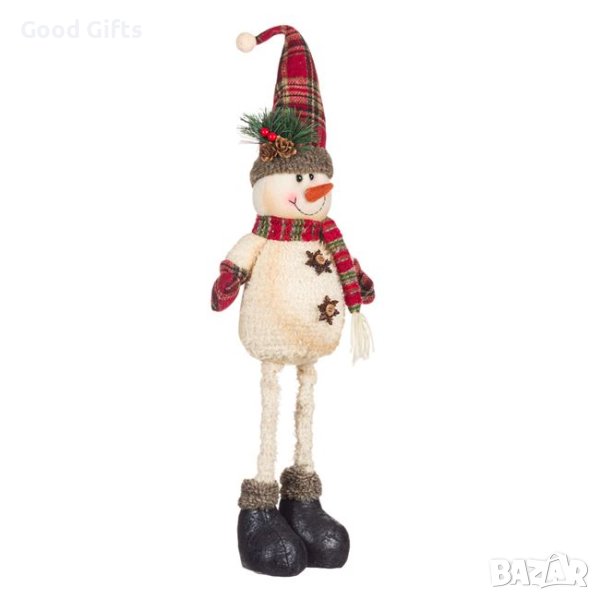 Коледен Снежен човек с дълги крака в почти бял костюм, червена карирана шапка и шал и борова клонка на шапката.