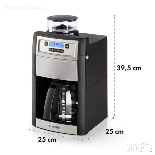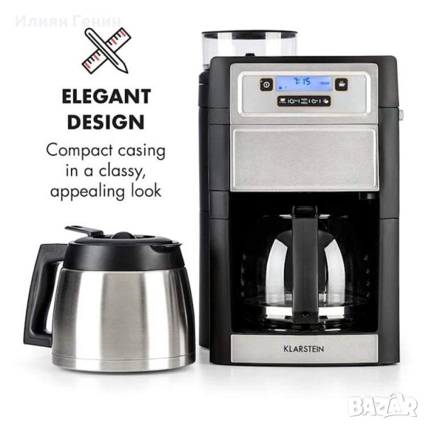 Откривайте истинското удоволствие от кафето всеки ден - кафе машината Klarstein Aromatica II Duo ще направи това възможно. Благодарение на вградената мелница и 150 г контейнер за кафе на зърна, кафето винаги ще бъде прясно смляно по време на всяко приготвяне. Благодарение на 5 избираеми нива на смилане от много фино до грубо, можете да регулирате силата на кафето според вашите желания. Колкото по-фин е прахът, толкова по-силно и ароматно ще бъде кафето. Благодарение на вградения таймер, кафе машината Klarstein Aromatica II Duo може лесно да стартира за минута в точно определеното време - така че сутрин се събуждате на миризмата на прясно сварено кафе или се връщате вкъщи вечер за ароматното си укрепване. Всички настройки се извършват лесно на лесно разбираем бутон за управление с LED дисплей. Компактното устройство с впечатляващ външен вид предлага още повече предимства, които увеличават насладата от кафе: стъклена кана с 1,25 л за 2 - 10 чаши кафе поддържа температурата до 40 минути благодарение на електрическата плоча. В допълнение към стъкления чайник, пакетът включва и термос, той дори веднага се вкарва директно в кафемашината и предлага горещо кафе дори няколко часа след приготвяне. Подвижният перманентен филтър не придава никакъв аромат на кафето поради неговата позлата и засилва естествения аромат на смляното кафе. Благодарение на еднакво сменяемия държач на филтъра, почистването без капене ще бъде лесно. Филтърът с активен въглен в резервоара за вода повишава качеството на водата и намалява запушването на устройството с варовик. Ясно видимата скала улеснява пълненето на резервоара с необходимото количество вода.