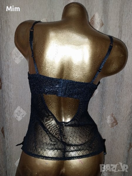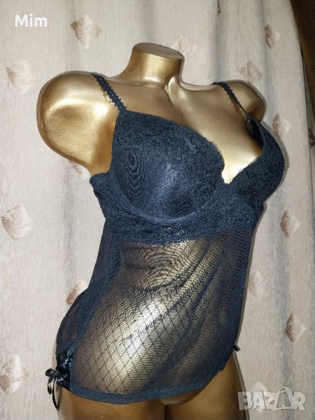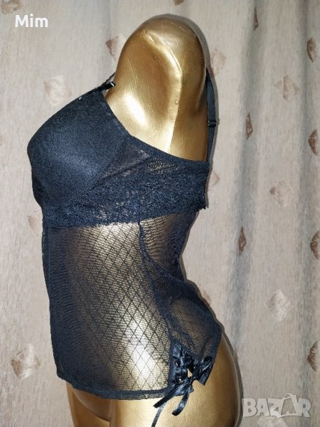 Чашката е твърда с банели, регулируеми презрамки триредово закопчаване, подгръдната е от 40 до 50 см едностранно, дължина 30 см под бюста е от еластичен прозрачен тюл на фигури странично може да се регулира със сатенена пандела. Неразличим от нов без хартиен носител.